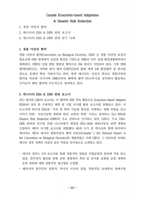 Canada Ecosystem-based Adaptation & Disaster Risk Reduction 1. 생물 다양성 협약 2. 캐나다의 EBA & DRR 관련 보고서 3. 캐나다의 EBA & DRR 관련 연구 사례 1. 생물 다양성 협약 생물 다양성 협약 Convention on Biological Diversity, CBD 은 생물 다양성 보전의 필요성에 대한 범세계적 공감대 형성을 기반으로 1992년 리우 유엔 환경개발회의에서 채택되어, 1993년 12월 29일 발효된 협약으로 194 개국이 가입되어 있다. 기후 변화 협약 UNFCCC , 사막화 방지 협약 UNFCCD 과 함께 세계 3대 환경협약 중 하나일 정도로 유엔의 핵심 사업이기도 하다. 한편 캐나다는 선진국 최초로 생물다양성 협약을 비준...