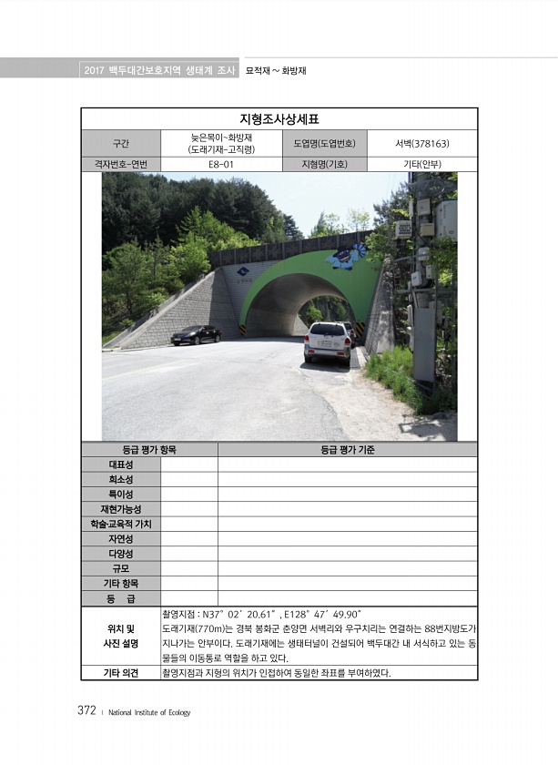 2017 백두대간보호지역 생태계 조사 묘적재 화방재 372 ? National Institute of Ecology 지형조사상세표 구간 늦은목이화방재 도래기재-고직령 도엽명 도엽번호 서벽 378163 격자번호-연번 E8-01 지형명 기호 기타 안부 등급 평가 항목 등급 평가 기준 대표성 희소성 특이성 재현가능성 학술?교육적 가치 자연성 다양성 규모 기타 항목 등 급 위치 및 사진 설명 촬영지점 N37°02′20.61″, E128°47′49.90″ 도래기재 770m 는 경북 봉화군 춘양면 서벽리와 우구치리는 연결하는 88번지방도가 지나가는 안부이다. 도래기재에는 생태터널이 건설되어 백두대간 내 서식하고 있는 동 물들의 이동통로 역할을 하고 있다. 기타 의견 촬영지점과 지형의 위치가 인접하여 동일한 좌표를부여하...