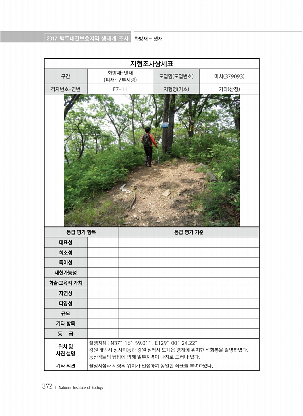 2017 백두대간보호지역 생태계 조사 화방재 댓재 372 ? National Institute of Ecology 지형조사상세표 구간 화방재댓재 피재구부시령 도엽명 도엽번호 마차 379093 격자번호-연번 E7-11 지형명 기호 기타 산정 등급 평가 항목 등급 평가 기준 대표성 희소성 특이성 재현가능성 학술?교육적 가치 자연성 다양성 규모 기타 항목 등 급 위치 및 사진 설명 촬영지점 N37°16′59.01″, E129°00′24.22″ 강원 태백시 상사미동과 강원 삼척시 도계읍 경계에 위치한 석희봉을 촬영하였다. 등산객들의 답압에 의해 일부지역이 나지로 드러나 있다. 기타 의견 촬영지점과 지형의 위치가 인접하여 동일한 좌표를부여하였다.