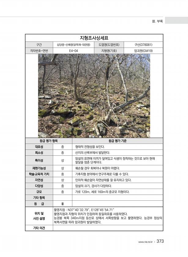 Ⅲ. 부록 www.nie.re.kr ? 373 지형조사상세표 구간 삽당령신배령 닭목재대관령 도엽명 도엽번호 구산 378081 격자번호-연번 E4-04 지형명 기호 암괴원 GM19 등급 평가 항목 등급 평가 기준 대표성 중 형태적 전형성을 보인다. 희소성 중 산지의 산록부에서 발달한다. 특이성 상 암설의 표면에 이끼가 덮여있고 식생이 정착하는 것으로 보아 현재 발달을 멈춘 단계이다. 재현가능성 상 훼손될 경우 회복이나 복원이 어렵다. 학술?교육적 가치 중 기후지형 분야에서 연구주제로 다룰 수 있다. 자연성 상 인위적 훼손없이 자연상태를 잘 유지하고 있다. 다양성 중 암설의 크기, 경사가 다양하다. 규모 중 가로 120m, 세로 160m의 중규모 지형이다. 기타 항목 등 급 Ⅲ 위치 및 사진 설명 촬영지점 N3...