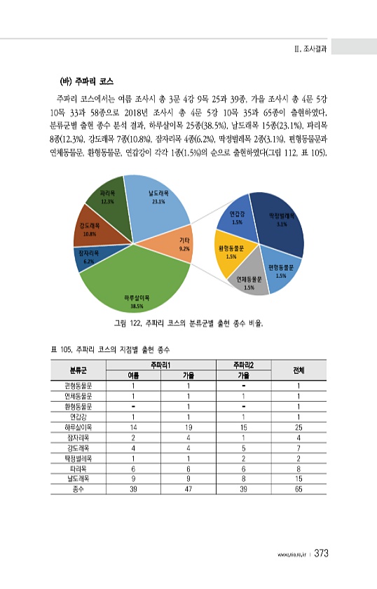Ⅱ. 조사결과 www.nie.re.kr ? 373 바 주파리 코스 주파리 코스에서는 여름 조사시 총 3문 4강 9목 25과 39종, 가을 조사시 총 4문 5강 10목 33과 58종으로 2018년 조사시 총 4문 5강 10목 35과 65종이 출현하였다. 분류군별 출현 종수 분석 결과, 하루살이목 25종 38.5% , 날도래목 15종 23.1% , 파리목 8종 12.3% , 강도래목 7종 10.8% , 잠자리목 4종 6.2% , 딱정벌레목 2종 3.1% , 편형동물문과 연체동물문, 환형동물문, 연갑강이 각각 1종 1.5% 의 순으로 출현하였다 그림 112, 표 105 그림 122. 주파리 코스의 분류군별 출현 종수 비율. 분류군 주파리1 주파리2 전체 여름 가을 가을 편형동물문 1 1 1 연체동물문 1 1 1 ...