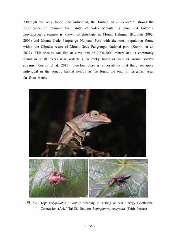 356 Although we only found one individual, the finding of L. cruentata shows the significance of retaining the habitat of Salak Mountain Figure 234 bottom Leptophryne cruentata is known to distribute in Mount Halimun Kurniati 2003, 2006 and Mount Gede Pangrango National Park with the most population found within the Cibodas resort of Mount Gede Pangrango National park Kusrini et al. 2017 This spec...