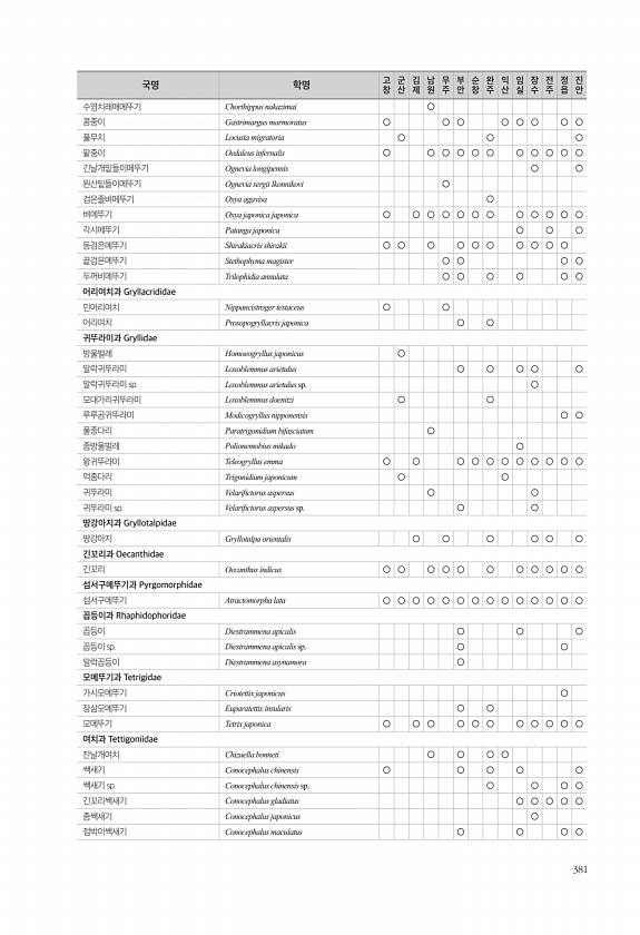 381 수염치레애메뚜기 Chorthippus nakazimai ○ 콩중이 Gastrimargus marmoratus ○ ○ ○ ○ ○ ○ ○ ○ 풀무치 Locusta migratoria ○ ○ ○ 팥중이 Oedaleus infernalis ○ ○ ○ ○ ○ ○ ○ ○ ○ ○ ○ 긴날개밑들이메뚜기 Ognevia longipennis ○ ○ 원산밑들이메뚜기 Ognevia sergii Ikonnikovi ○ 검은줄벼메뚜기 Oxya agavisa ○ 벼메뚜기 Oxya japonica japonica ○ ○ ○ ○ ○ ○ ○ ○ ○ ○ ○ ○ 각시메뚜기 Patanga japonica ○ ○ ○ 등검은메뚜기 Shirakiacris shirakii ○ ○ ○ ○ ○ ○ ○ ○ ○ ○ 끝검은메뚜기 Stethophyma m...