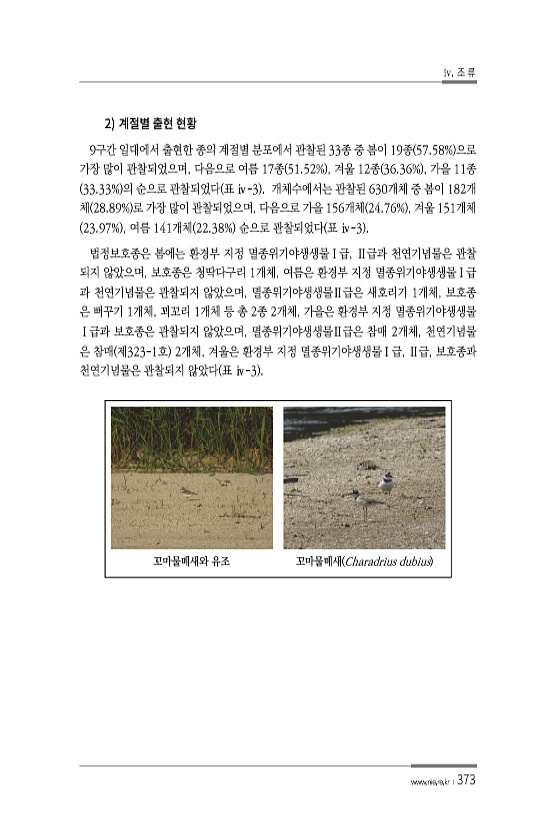 iv. 조 류 www.nie.re.kr ? 373 2 9구간 일대에서 출현한 종의 계절별 분포에서 관찰된 33종 중 봄이 19종 57.58% 으로 가장 많이 관찰되었으며, 다음으로 여름 17종 51.52% , 겨울 12종 36.36% , 가을 11종 33.33% 의 순으로 관찰되었다 표 ⅳ-3 개체수에서는 관찰된 630개체 중 봄이 182개 체 28.89% 로 가장 많이 관찰되었으며, 다음으로 가을 156개체 24.76% , 겨울 151개체 23.97% , 여름 141개체 22.38% 순으로 관찰되었다 표 ⅳ-3 법정보호종은 봄에는 환경부 지정 멸종위기야생생물Ⅰ급, Ⅱ급과 천연기념물은 관찰 되지 않았으며, 보호종은 청딱다구리 1개체, 여름은 환경부 지정 멸종위기야생생물Ⅰ급 과 천연기념물은 관찰되지 않았으며,...