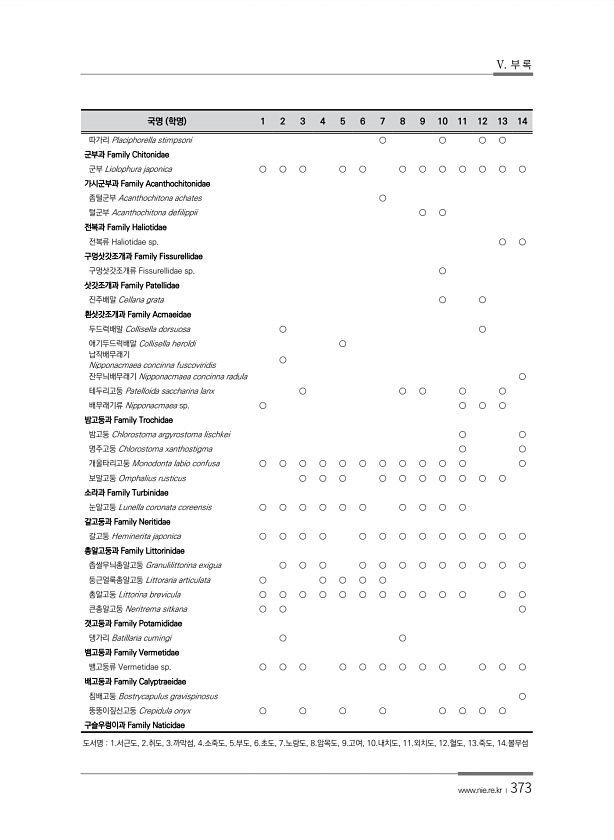 V. 부 록 www.nie.re.kr ?373 국명 학명 1 2 3 4 5 6 7 8 9 10 11 12 13 14 따가리 Placiphorella stimpsoni ○ ○ ○ ○ 군부과 Family Chitonidae 군부 Liolophura japonica ○ ○ ○ ○ ○ ○ ○ ○ ○ ○ ○ ○ 가시군부과 Family Acanthochitonidae 좀털군부 Acanthochitona achates ○ 털군부 Acanthochitona defilippii ○ ○ 전복과 Family Haliotidae 전복류 Haliotidae sp. ○ ○ 구멍삿갓조개과 Family Fissurellidae 구멍삿갓조개류 Fissurellidae sp. ○ 삿갓조개과 Family Patellidae 진주배말 Cell...