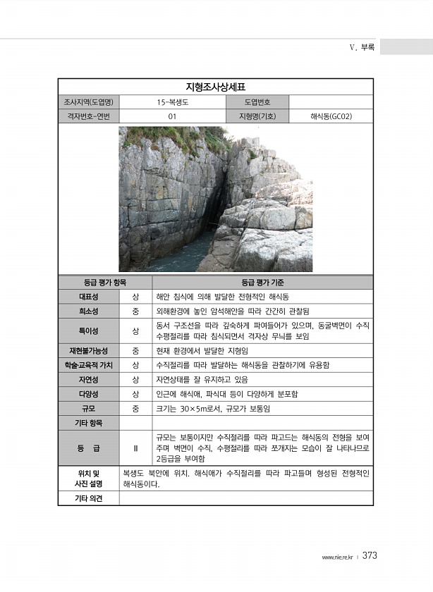 Ⅴ. 부록 www.nie.re.kr ? 373 지형조사상세표 조사지역 도엽명 15-복생도 도엽번호 격자번호-연번 01 지형명 기호 해식동 GC02 등급 평가 항목 등급 평가 기준 대표성 상 해안 침식에 의해 발달한 전형적인 해식동 희소성 중 외해환경에 놓인 암석해안을 따라 간간히 관찰됨 특이성 상 동서 구조선을 따라 깊숙하게 파여들어가 있으며, 동굴벽면이 수직 수평절리를 따라 침식되면서 격자상 무늬를 보임 재현불가능성 중 현재 환경에서 발달한 지형임 학술?교육적 가치 상 수직절리를 따라 발달하는 해식동을 관찰하기에 유용함 자연성 상 자연상태를 잘 유지하고 있음 다양성 상 인근에 해식애, 파식대 등이 다양하게 분포함 규모 중 크기는 30×5m로서, 규모가 보통임 기타 항목 등 급 Ⅱ 규모는 보통이지만 수직절리...