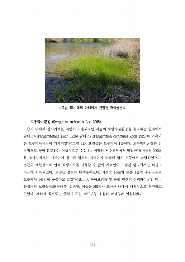 357 그림 30 데크 아래에서 관찰된 까락골군락 도루박이군집 Scirpetum radicantis Lee 2005 습지 내에서 갈수기에는 지면이 노출되지만 과습의 토양수분환경을 유지하는 입지에서 갈대군목 Phragmitetalia Koch 1926 Phragmition communis Koch 1926 갈대군단 에 귀속되 는 도루박이군집이 기재되었다 그림 표징종은 도루박이 종이다 도루박이군집은 전 31 1 국적으로 광역 분포하는 식생형으로 수심 미만의 저수위역에서 발달한다 이율경 1m 2005 본 조사지에서는 지표면이 침수된 입지와 지표면이 노출된 입지 모두에서 발달하였으나, 접근의 제한성으로 인해 식생조사를 시행할 수 없어 지표면이 노출된 입지에서만 식생조 사표가 획득되었다 토양은 점토가 대부분이었다 식...