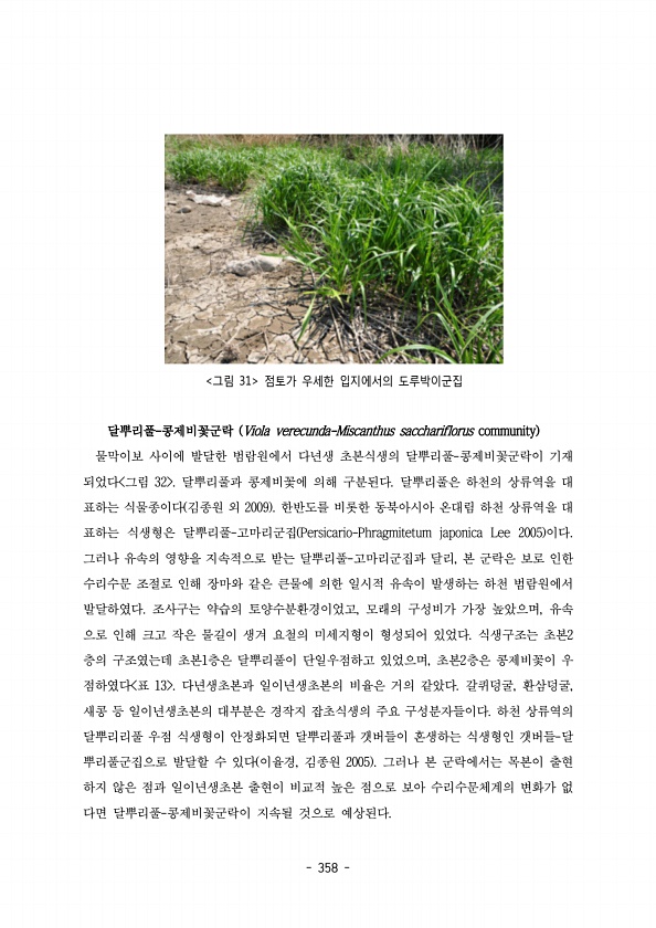 358 그림 31 점토가 우세한 입지에서의 도루박이군집 달뿌리풀 콩제비꽃군락 Viola verecunda-Miscanthus sacchariflorus community 물막이보 사이에 발달한 범람원에서 다년생 초본식생의 달뿌리풀 콩제비꽃군락이 기재 되었다 그림 달뿌리풀과 콩제비꽃에 의해 구분된다 달뿌리풀은 하천의 상류역을 대 32 표하는 식물종이다 김종원 외 한반도를 비롯한 동북아시아 온대림 하천 상류역을 대 2009 표하는 식생형은 달뿌리풀 고마리군집 Persicario-Phragmitetum japonica Lee 2005 이다 그러나 유속의 영향을 지속적으로 받는 달뿌리풀 고마리군집과 달리 본 군락은 보로 인한 , 수리수문 조절로 인해 장마와 같은 큰물에 의한 일시적 유속이 발생하는 하천 범람원에서 ...