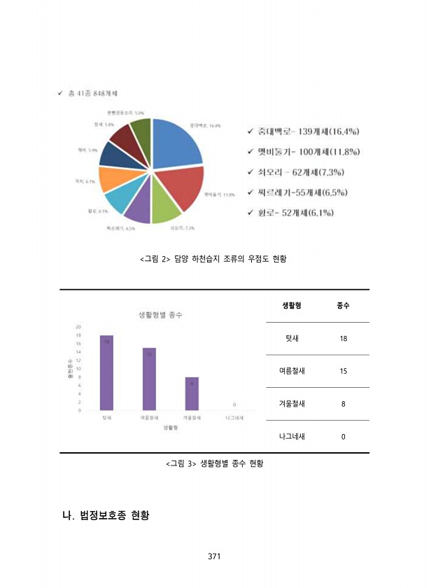 371 그림 2 담양 하천습지 조류의 우점도 현황 생활형 종수 텃새 18 여름철새 15 겨울철새 8 나그네새 0 그림 3 생활형별 종수 현황 나. 법정보호종현황