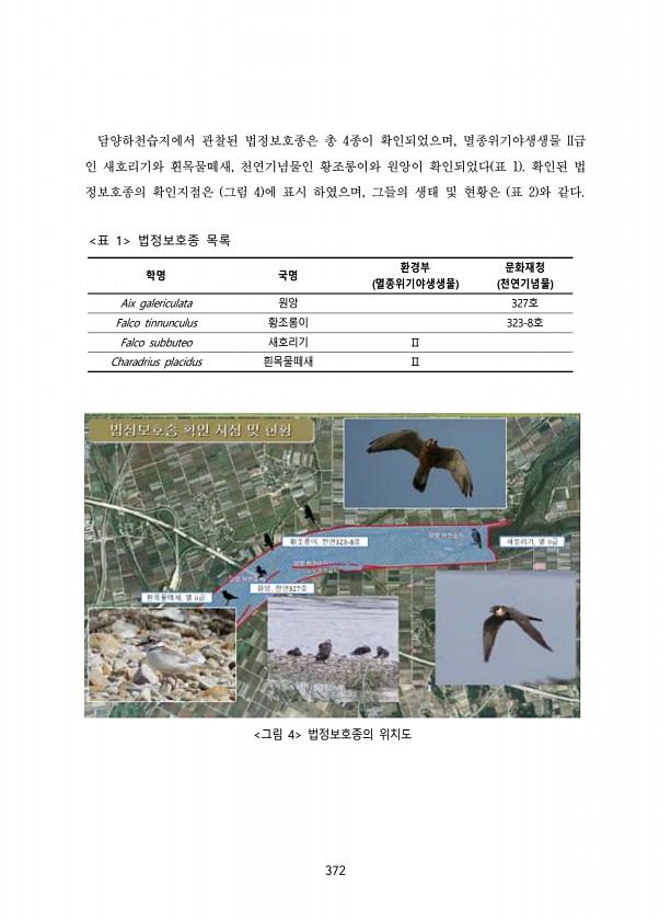 372 담양하천습지에서 관찰된 법정보호종은 총 4종이 확인되었으며, 멸종위기야생생물 II급 인 새호리기와 흰목물떼새, 천연기념물인 황조롱이와 원앙이 확인되었다 표 1 확인된 법 정보호종의 확인지점은 그림 4 에 표시 하였으며, 그들의 생태 및 현황은 표 2 와 같다. 학명 국명 환경부 멸종위기야생생물 문화재청 천연기념물 Aix galericulata 원앙 327호 Falco tinnunculus 황조롱이 323-8호 Falco subbuteo 새호리기 Ⅱ Charadrius placidus 흰목물떼새 Ⅱ 표 1 법정보호종 목록 그림 4 법정보호종의위치도