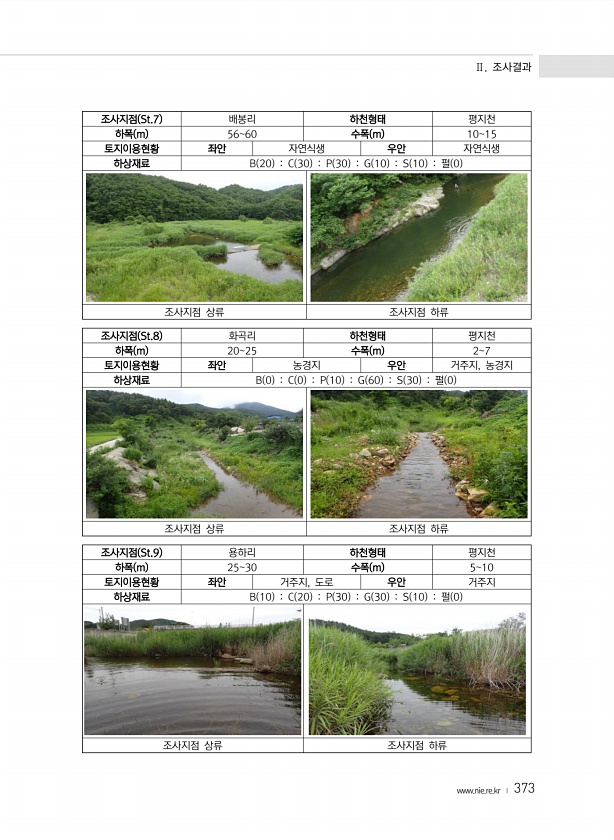 Ⅱ. 조사결과 www.nie.re.kr ? 373 조사지점 St.7 배봉리 하천형태 평지천 하폭 m 5660 수폭 m 1015 토지이용현황 좌안 자연식생 우안 자연식생 하상재료 B 20 C 30 P 30 G 10 S 10 펄 0 조사지점 상류 조사지점 하류 조사지점 St.8 화곡리 하천형태 평지천 하폭 m 2025 수폭 m 27 토지이용현황 좌안 농경지 우안 거주지, 농경지 하상재료 B 0 C 0 P 10 G 60 S 30 펄 0 조사지점 상류 조사지점 하류 조사지점 St.9 용하리 하천형태 평지천 하폭 m 2530 수폭 m 510 토지이용현황 좌안 거주지, 도로 우안 거주지 하상재료 B 10 C 20 P 30 G 30 S 10 펄 0 조사지점 상류 조사지점하류