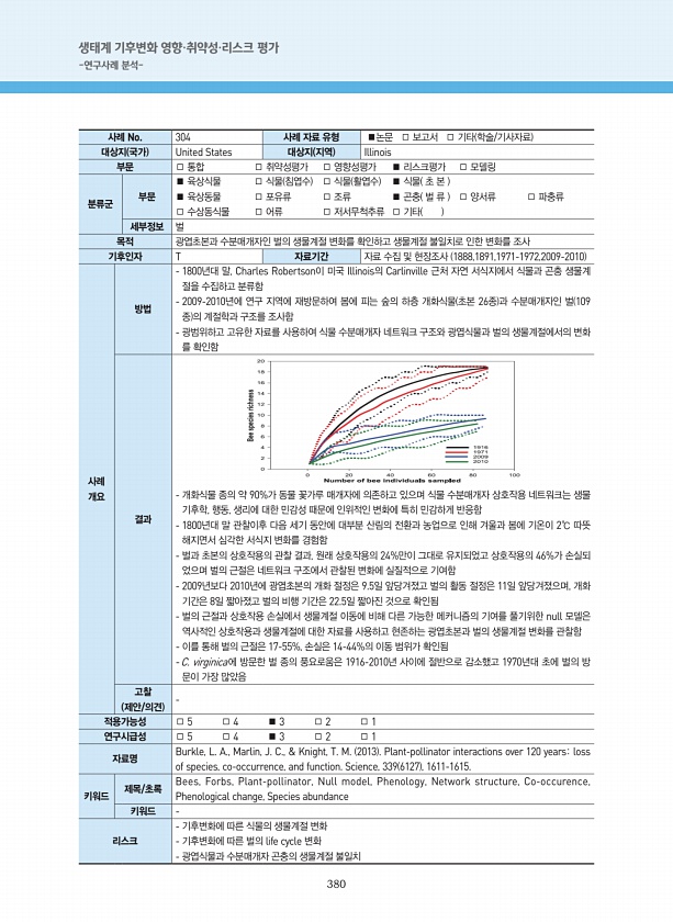380 생태계 기후변화 영향·취약성·리스크 평가 -연구사례 분석- 사례 No. 304 사례 자료 유형 ■논문 □ 보고서 □ 기타 학술/기사자료 대상지 국가 United States 대상지 지역 Illinois 부문 □ 통합 □ 취약성평가 □ 영향성평가 ■ 리스크평가 □ 모델링 분류군 부문 ■ 육상식물 □ 식물 침엽수 □ 식물 활엽수 ■ 식물 초 본 ■ 육상동물 □ 포유류 □ 조류 ■ 곤충 벌 류 □ 양서류 □ 파충류 □ 수상동식물 □ 어류 □ 저서무척추류 □ 기타 세부정보 벌 목적 광엽초본과 수분매개자인 벌의 생물계절 변화를 확인하고 생물계절 불일치로 인한 변화를 조사 기후인자 T 자료기간 자료 수집 및 현장조사 1888,1891,1971-1972,2009-2010 사례 개요 방법 1800년대 말, Char...