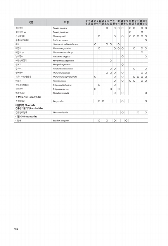 382 줄베짱이 Ducetia japonica ○ ○ ○ ○ ○ ○ ○ ○ 줄베짱이 sp. Ducetia japonica sp. ○ ○ 큰실베짱이 Elimaea grandis ○ ○ ○ ○ ○ ○ ○ ○ 등줄어리쌕새기 Eoxizicus coreanus ○ 여치 Gampsocleis sedakovi abscura ○ ○ ○ ○ 베짱이 Hexacentrus japonicus ○ ○ ○ ○ ○ ○ ○ 베짱이 sp. Hexacentrus unicolor sp. ○ 날베짱이 Holochlora longifssa ○ ○ 북방실베짱이 Kuwayamaea sapporensis ○ 철써기 Mecopoda niponensis ○ 갈색여치 Paratlanticus ussuriensis ○ ○ ○ ○ 실베짱이 Phaneropte...