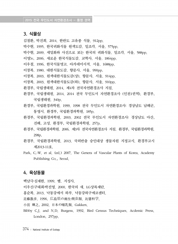 2015 전국 무인도서 자연환경조사 통영 권역 374 ? National Institute of Ecology 3. 식물상 김철환, 박진희. 2014. 한반도 고유종 식물. 912pp. 박수현. 1995. 한국귀화식물 원색도감. 일조각. 서울. 575pp. 박수현. 2009. 세밀화와 사진으로 보는 한국의 귀화식물. 일조각. 서울. 588pp. 이영노. 2006. 새로운 한국식물도감. 교학사. 서울. 1864pp. 이우철. 1996. 한국식물명고. 아카데미서적. 서울. 1688pp. 이창복. 1980. 대한식물도감. 향문사. 서울. 990pp. 이창복. 2003. 원색대한식물도감 상 향문사. 서울. 914pp. 이창복. 2003. 원색대한식물도감 하 향문사. 서울. 910pp. 환경부, 국립생태원. 2014...