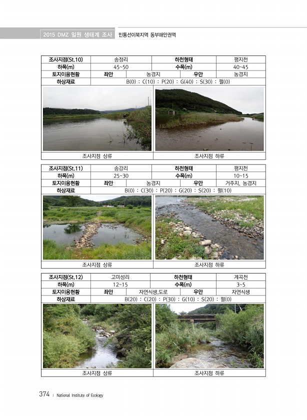 2015 DMZ 일원 생태계 조사 민통선이북지역 동부해안권역 374 ? National Institute of Ecology 조사지점 St.10 송정리 하천형태 평지천 하폭 m 4550 수폭 m 4045 토지이용현황 좌안 농경지 우안 농경지 하상재료 B 0 C 10 P 20 G 40 S 30 펄 0 조사지점 상류 조사지점 하류 조사지점 St.11 송강리 하천형태 평지천 하폭 m 2530 수폭 m 1015 토지이용현황 좌안 농경지 우안 거주지, 농경지 하상재료 B 0 C 30 P 20 G 20 S 20 펄 10 조사지점 상류 조사지점 하류 조사지점 St.12 고미성리 하천형태 계곡천 하폭 m 1215 수폭 m 35 토지이용현황 좌안 자연식생,도로 우안 자연식생 하상재료 B 20 C 20 P 30 G 10 S ...