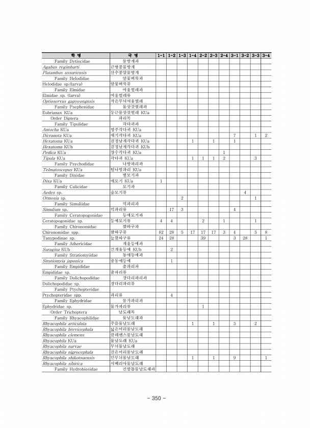 학 명 국 명 1-1 1-2 1-3 1-4 2-2 2-3 2-4 3-1 3-2 3-3 3-4 Family Dytiscidae 물방개과 Agabus regimbarti 큰땅콩물방개 Platambus ussuriensis 산수콩알물방개 Family Helodidae 알꽃벼룩과 Helodidae sp. larva 알꽃벼룩류 Family Elmidae 여울벌레과 Elmidae sp. larva 여울벌레류 Optioservus gapyeongnsis 작은무늬여울벌레 Family Psephenidae 물삿갓벌레과 Eubrianax KUa ...