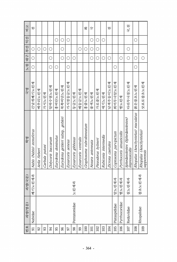 번호 과명 영문 과명 국문 학명 국명 노원 대구 부산 익산 비고 91 Nabidae 쐐기노린재과 Nabis Nabis stenoferus 긴날개쐐기노린재 ○ ○ ○ 천 92 Pentatomidae 노린재과 Aelia fieberi 메추리노린재 ○ 93 Carbula putoni 가시노린재 ○ 94 Dolycoris baccarum 알락수염노린재 ○ ○ ○ 95 Eurydema dominulus 홍비단노린재 ○ ○ 96 Eurydema gebleri subsp. gebleri 북쪽비단노린재 ○ ○ ○ 97 Eysarcoris aeneus 가시점둥글노린재 ○ ○ ○ 98 Eysarcoris gibbosus 둥글노린재 ○ 99 Eysarcoris ventralis 배둥글노린재 ○ 100 Graphosoma rub...