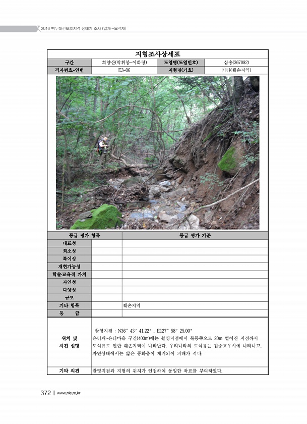 2016 백두대간보호지역 생태계 조사 밀재묘적재 372Ⅰwww.nie.re.kr 지형조사상세표 구간 희양산 악휘봉-이화령 도엽명 도엽번호 삼송 367082 격자번호-연번 E3-06 지형명 기호 기타 훼손지역 등급 평가 항목 등급 평가 기준 대표성 희소성 특이성 재현가능성 학술?교육적 가치 자연성 다양성 규모 기타 항목 훼손지역 등 급 위치 및 사진 설명 촬영지점 N36° 43′ 41.22″ , E127° 58′ 25.00″ 은티재은티마을 구간 400m 에는 촬영지점에서 북동쪽으로 20m 떨어진 지점까지 토석류로 인한 훼손지역이 나타난다. 우리나라의 토석류는 집중호우시에 나타나고, 자연상태에서는 얇은 풍화층이 제거되어 피해가 적다. 기타 의견 촬영지점과 지형의 위치가 인접하여 동일한 좌표를부여하였다.