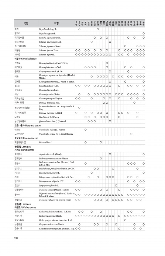 380 꽈리 Physalis alkekengi L. ○ ○ 땅꽈리 Physalis angulata L. ○ 미치광이풀 Scopolia japonica Maxim. ○ ○ ○ ○ ○ ○ 미국까마중 Solanum americanum Mill. ○ ○ 좁은잎배풍등 Solanum japonense Nakai ○ ○ ○ ○ 배풍등 Solanum lyratum Thunb. ○ ○ ○ ○ ○ ○ ○ ○ ○ ○ ○ ○ ○ ○ 까마중 Solanum nigrum L. ○ ○ ○ ○ ○ ○ ○ ○ ○ ○ ○ ○ ○ ○ ○ ○ ○ ○ ○ 메꽃과 Convolvulaceae 선메꽃 Calystegia dahurica Herb. Choisy ○ 애기메꽃 Calystegia hederacea Wall. ○ ○ ○ ○ ○ ○ ○ ○ 큰메...