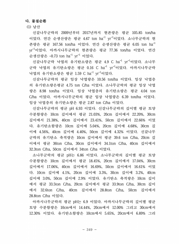 349 다. 물질순환 1 남산 신갈나무군락의 2009년부터 2017년까지 현존량은 평균 105.85 ton/ha 이었다. 연간 순생산량은 평균 4.67 ton ha-1 yr-1이었다. 소나무군락의 현 존량은 평균 167.56 ton/ha 이었다. 연간 순생산량은 평균 6.05 ton ha-1 yr-1이었다. 아까시나무군락의 현존량은 평균 77.36 ton/ha 이었다. 연간 순생산량은 -0.73 ton ha-1 yr-1 이었다. 신갈나무군락 낙엽의 유기탄소량은 평균 4.9 C ha-1 yr-1이었다. 소나무 군락 낙엽의 유기탄소량은 평균 0.16 C ha-1 yr-1이었다. 아까시나무군락 낙엽의 유기탄소량은 평균 1.59 C ha-1 yr-1이었다. 신갈나무군락의 평균 임상 낙엽량은 10.56 ton/ha ...