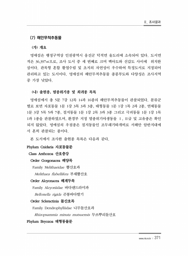 Ⅱ. 조사결과 www.nie.re.kr ? 371 7 해안무척추동물 가 개요 멍애섬은 행정구역상 인천광역시 옹진군 덕적면 울도리에 소속되어 있다. 도서면 적은 36,397㎡으로, 조사 도서 중 세 번째로 크며 백아도와 선갑도 사이에 위치한 섬이다. 관목형 혼합 활엽수림 및 초지의 자연성이 우수하여 특정도서로 지정되어 관리하고 있는 도서이다. 멍애섬의 해안무척추동물 종풍부도와 다양성은 조사지역 중 가장 낮았다. 나 출현종, 멸종위기종 및 희귀종 목록 멍애섬에서 총 5문 7강 12목 14과 16종의 해안무척추동물이 관찰되었다. 분류군 별로 보면 자포동물 1문 1강 3목 3과 3종, 태형동물 1문 1강 1목 2과 2종, 연체동물 1문 3강 5목 5과 7종, 절지동물 1문 1강 2목 3과 3종 그리고 극피동물 1문...