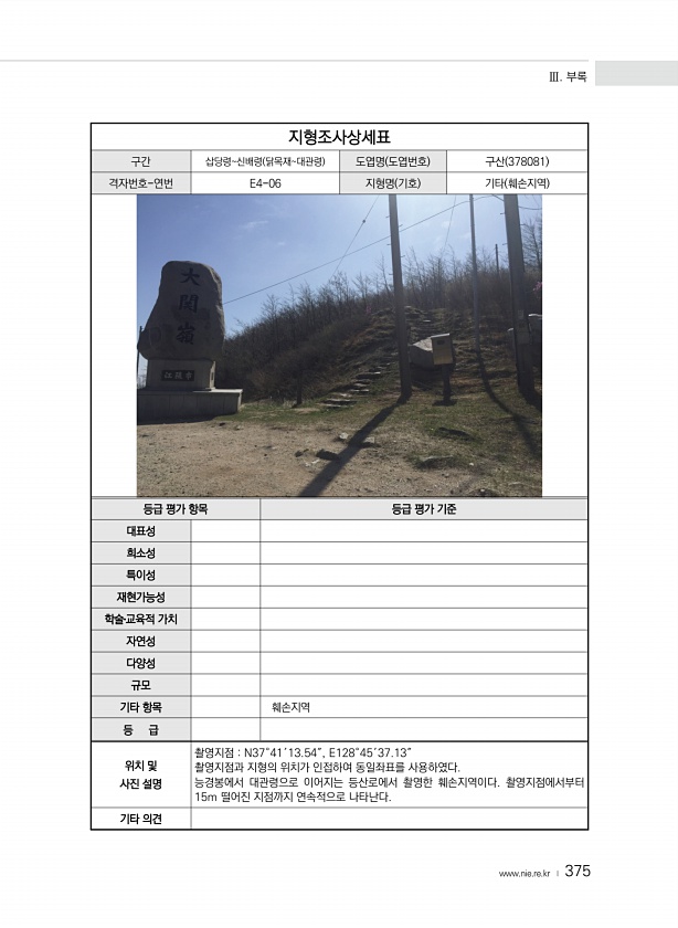 Ⅲ. 부록 www.nie.re.kr ? 375 지형조사상세표 구간 삽당령신배령 닭목재대관령 도엽명 도엽번호 구산 378081 격자번호-연번 E4-06 지형명 기호 기타 훼손지역 등급 평가 항목 등급 평가 기준 대표성 희소성 특이성 재현가능성 학술?교육적 가치 자연성 다양성 규모 기타 항목 훼손지역 등 급 위치 및 사진 설명 촬영지점 N37°41′13.54″, E128°45′37.13″ 촬영지점과 지형의 위치가 인접하여 동일좌표를 사용하였다. 능경봉에서 대관령으로 이어지는 등산로에서 촬영한 훼손지역이다. 촬영지점에서부터 15m 떨어진 지점까지 연속적으로 나타난다. 기타의견