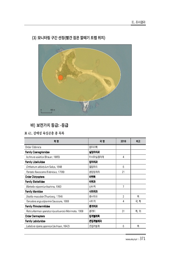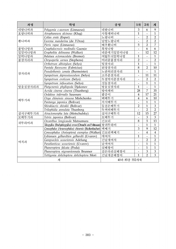 II. 조사결과 www.nie.re.kr ?371 3 학 명 국 명 2018 비고 Order Odonata 잠자리목 Family Coenagrionidae 실잠자리과 Ischnura asiatica Brauer, 1865 아시아실잠자리 4 Family Libellulidae 잠자리과 Orthetrum albistylum Selys, 1848 밀잠자리 6 Pantala flavescens Fabricius, 1798 된장잠자리 21 Order Dictyoptera 바퀴목 Family Blattellidae 바퀴과 Blattella nipponica Asahina, 1963 산바퀴 7 Family Mantidae 사마귀과 Statilia maculata Thunberg, 1784 좀사마귀 2 특 Tenodera...