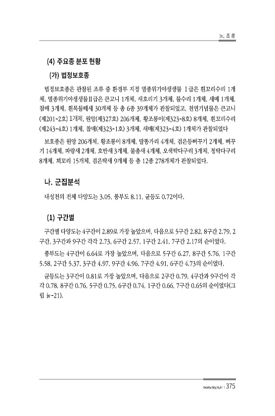 iv. 조 류 www.nie.re.kr ? 375 4 법정보호종은 관찰된 조류 중 환경부 지정 멸종위기야생생물 Ⅰ급은 흰꼬리수리 1개 체, 멸종위기야생생물Ⅱ급은 큰고니 1개체, 새호리기 3개체, 물수리 1개체, 새매 1개체, 참매 3개체, 흰목물떼새 30개체 등 총 6종 39개체가 관찰되었고, 천연기념물은 큰고니 제201-2호 , 원앙 제327호 206개체, 황조롱이 제323-8호 8개체, 흰꼬리수리 제243-4호 1개체, 참매 제323-1호 3개체, 새매 제323-4호 1개체가 관찰되었다 보호종은 원앙 206개체, 황조롱이 8개체, 말똥가리 4개체, 검은등뻐꾸기 2개체, 뻐꾸 기 14개체, 파랑새 2개체, 호반새 3개체, 물총새 4개체, 오색딱다구리 3개체, 청딱다구리 8개체, 꾀꼬리 15개체, 검은딱새 ...