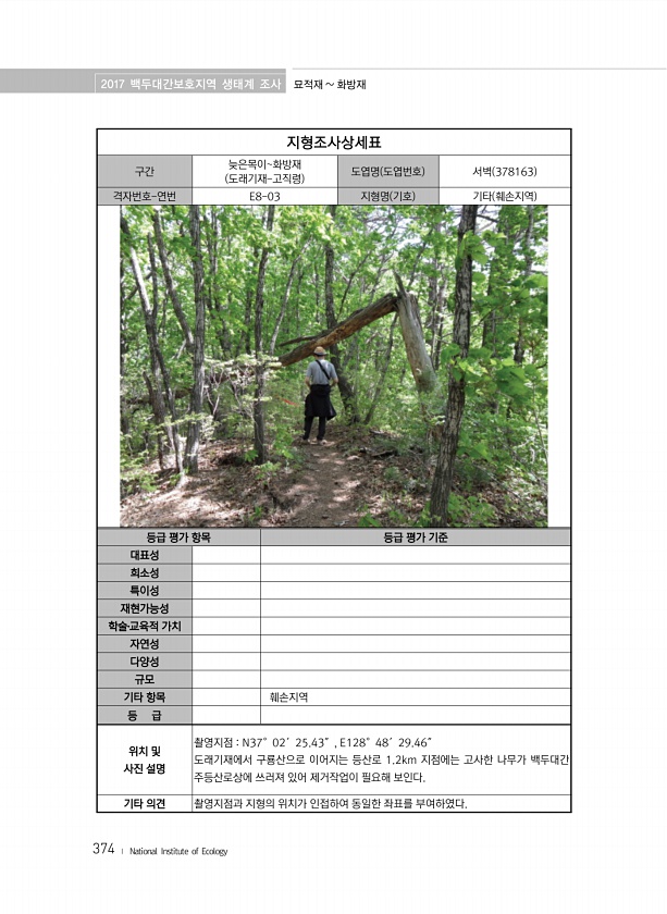 2017 백두대간보호지역 생태계 조사 묘적재 화방재 374 ? National Institute of Ecology 지형조사상세표 구간 늦은목이화방재 도래기재-고직령 도엽명 도엽번호 서벽 378163 격자번호-연번 E8-03 지형명 기호 기타 훼손지역 등급 평가 항목 등급 평가 기준 대표성 희소성 특이성 재현가능성 학술?교육적 가치 자연성 다양성 규모 기타 항목 훼손지역 등 급 위치 및 사진 설명 촬영지점 N37°02′25.43″, E128°48′29.46″ 도래기재에서 구룡산으로 이어지는 등산로 1.2km 지점에는 고사한 나무가 백두대간 주등산로상에 쓰러져 있어 제거작업이 필요해 보인다. 기타 의견 촬영지점과 지형의 위치가 인접하여 동일한 좌표를부여하였다.