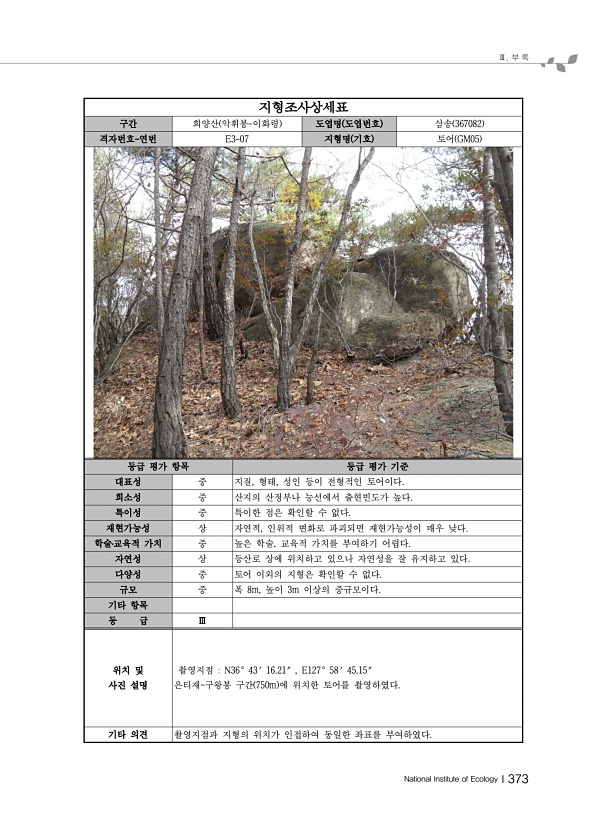 Ⅲ. 부 록 National Institute of EcologyⅠ373 지형조사상세표 구간 희양산 악휘봉-이화령 도엽명 도엽번호 삼송 367082 격자번호-연번 E3-07 지형명 기호 토어 GM05 등급 평가 항목 등급 평가 기준 대표성 중 지질, 형태, 성인 등이 전형적인 토어이다. 희소성 중 산지의 산정부나 능선에서 출현빈도가 높다. 특이성 중 특이한 점은 확인할 수 없다. 재현가능성 상 자연적, 인위적 변화로 파괴되면 재현가능성이 매우 낮다. 학술?교육적 가치 중 높은 학술, 교육적 가치를 부여하기 어렵다. 자연성 상 등산로 상에 위치하고 있으나 자연성을 잘 유지하고 있다. 다양성 중 토어 이외의 지형은 확인할 수 없다. 규모 중 폭 8m, 높이 3m 이상의 중규모이다. 기타 항목 등 급 Ⅲ 위치 및...