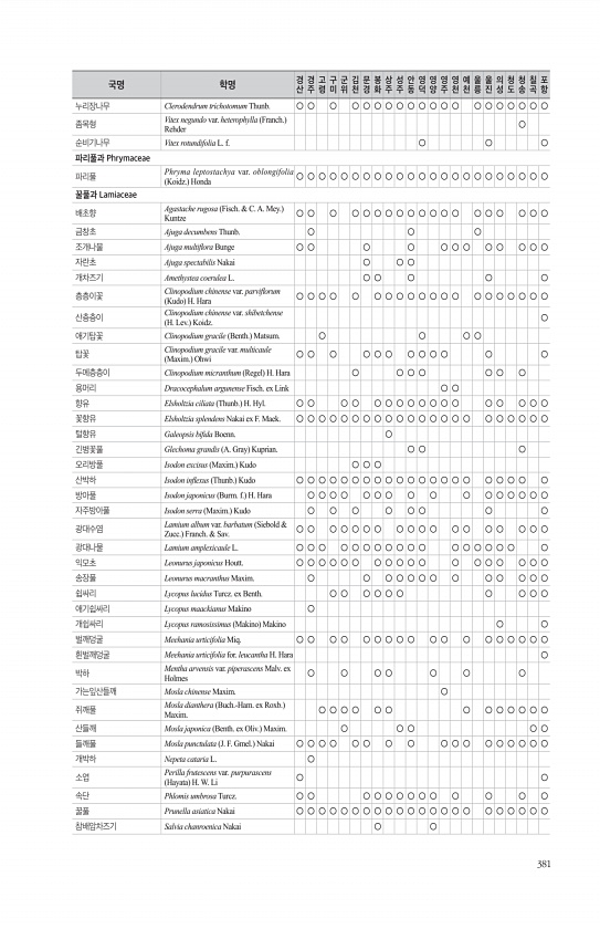 381 누리장나무 Clerodendrum trichotomum Thunb. ○ ○ ○ ○ ○ ○ ○ ○ ○ ○ ○ ○ ○ ○ ○ ○ ○ ○ ○ ○ 좀목형 Vitex negundo var. heterophylla Franch. Rehder ○ 순비기나무 Vitex rotundifolia L. f. ○ ○ ○ 파리풀과 Phrymaceae 파리풀 Phryma leptostachya var. oblongifolia Koidz. Honda ○ ○ ○ ○ ○ ○ ○ ○ ○ ○ ○ ○ ○ ○ ○ ○ ○ ○ ○ ○ ○ ○ ○ 꿀풀과 Lamiaceae 배초향 Agastache rugosa Fisch. & C. A. Mey. Kuntze ○ ○ ○ ○ ○ ○ ○ ○ ○ ○ ○ ○ ○ ○ ○ ○ ○ ○ ○ 금창초 Ajuga d...