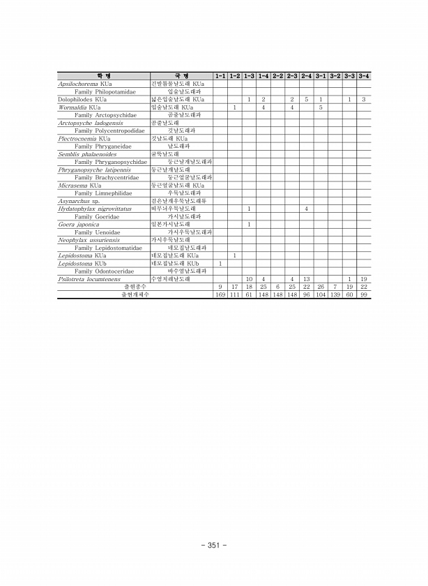 학 명 국 명 1-1 1-2 1-3 1-4 2-2 2-3 2-4 3-1 3-2 3-3 3-4 Apsilochorema KUa 긴발톱물날도래 KUa Family Philopotamidae 입술날도래과 Dolophilodes KUa 넓은입술날도래 KUa 1 2 2 5 1 1 3 Wormaldia KUa 입술날도래 KUa 1 4 4 5 Family Arctopsychidae 곰줄날도래과 Arctopsyche ladogensis 곰줄날도래 Family Polycentropodidae 깃날도래과 Plectrocnemia KUa 깃날도래 KUa ...