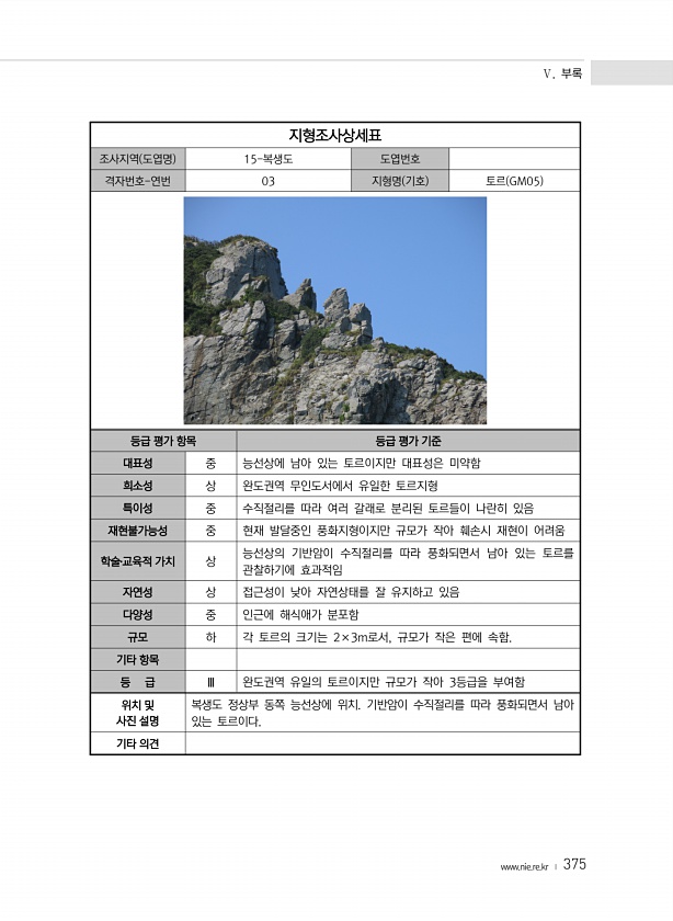 Ⅴ. 부록 www.nie.re.kr ? 375 지형조사상세표 조사지역 도엽명 15-복생도 도엽번호 격자번호-연번 03 지형명 기호 토르 GM05 등급 평가 항목 등급 평가 기준 대표성 중 능선상에 남아 있는 토르이지만 대표성은 미약함 희소성 상 완도권역 무인도서에서 유일한 토르지형 특이성 중 수직절리를 따라 여러 갈래로 분리된 토르들이 나란히 있음 재현불가능성 중 현재 발달중인 풍화지형이지만 규모가 작아 훼손시 재현이 어려움 학술?교육적 가치 상 능선상의 기반암이 수직절리를 따라 풍화되면서 남아 있는 토르를 관찰하기에 효과적임 자연성 상 접근성이 낮아 자연상태를 잘 유지하고 있음 다양성 중 인근에 해식애가 분포함 규모 하 각 토르의 크기는 2×3m로서, 규모가 작은 편에 속함. 기타 항목 등 급 Ⅲ 완도권역...