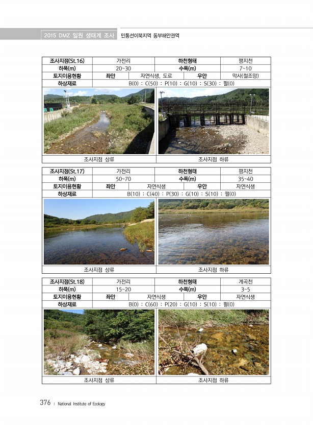 2015 DMZ 일원 생태계 조사 민통선이북지역 동부해안권역 376 ? National Institute of Ecology 조사지점 St.16 가전리 하천형태 평지천 하폭 m 2030 수폭 m 710 토지이용현황 좌안 자연식생, 도로 우안 막사 철조망 하상재료 B 0 C 50 P 10 G 10 S 30 펄 0 조사지점 상류 조사지점 하류 조사지점 St.17 가전리 하천형태 평지천 하폭 m 5070 수폭 m 3540 토지이용현황 좌안 자연식생 우안 자연식생 하상재료 B 10 C 40 P 30 G 10 S 10 펄 0 조사지점 상류 조사지점 하류 조사지점 St.18 가전리 하천형태 계곡천 하폭 m 1520 수폭 m 35 토지이용현황 좌안 자연식생 우안 자연식생 하상재료 B 0 C 60 P 20 G 10 S 1...