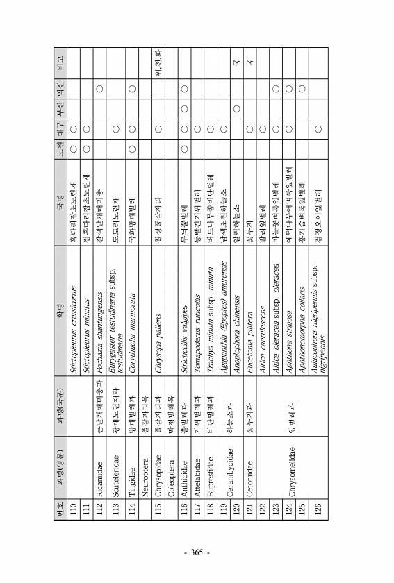 번호 과명 영문 과명 국문 학명 국명 노원 대구 부산 익산 비고 110 Stictopleurus crassicornis 흑다리잡초노린재 ○ ○ 111 Stictopleurus minutus 점흑다리잡초노린재 ○ ○ 112 Ricaniidae 큰날개매미충과 Pochazia shantungensis 갈색날개매미충 ○ 113 Scuteleridae 광대노린재과 Eurygaster testudinaria subsp. testudinaria 도토리노린재 ○ 114 Tingidae 방패벌레과 Corythucha marmorata 국화방패벌레 ○ ○ ○ Neuroptera 풀잠자리목 115 Chrysopidae 풀잠자리과 Chrysopa pallens 칠성풀잠자리 ○ 위,천,화 Coleoptera 딱정벌레목 116 An...