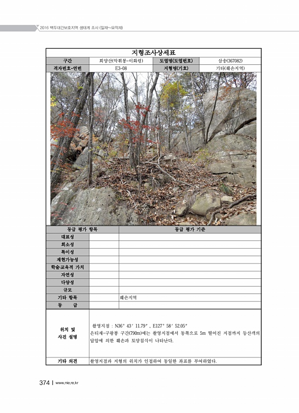 2016 백두대간보호지역 생태계 조사 밀재묘적재 374Ⅰwww.nie.re.kr 지형조사상세표 구간 희양산 악휘봉-이화령 도엽명 도엽번호 삼송 367082 격자번호-연번 E3-08 지형명 기호 기타 훼손지역 등급 평가 항목 등급 평가 기준 대표성 희소성 특이성 재현가능성 학술?교육적 가치 자연성 다양성 규모 기타 항목 훼손지역 등 급 위치 및 사진 설명 촬영지점 N36° 43′ 11.79″ , E127° 58′ 52.05″ 은티재구왕봉 구간 790m 에는 촬영지점에서 동쪽으로 5m 떨어진 지점까지 등산객의 답압에 의한 훼손과 토양침식이 나타난다. 기타 의견 촬영지점과 지형의 위치가 인접하여 동일한 좌표를부여하였다.