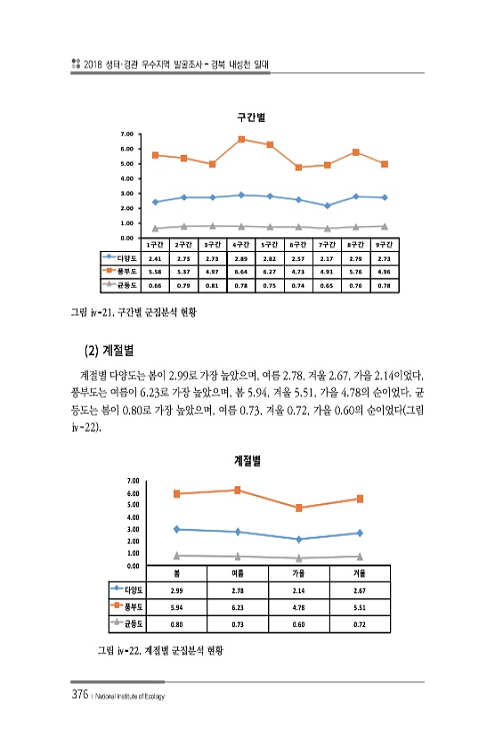 2018 생태·경관 우수지역 발굴조사 경북 내성천 일대 376 ? National Institute of Ecology 1구간 2구간 3구간 4구간 5구간 6구간 7구간 8구간 9구간 다양도 2.41 2.73 2.73 2.89 2.82 2.57 2.17 2.79 2.73 풍부도 5.58 5.37 4.97 6.64 6.27 4.73 4.91 5.76 4.96 균등도 0.66 0.79 0.81 0.78 0.75 0.74 0.65 0.76 0.78 0.00 1.00 2.00 3.00 4.00 5.00 6.00 7.00 구간별 그림 ⅳ-21. 구간별 군집분석 현황 2 계절별 다양도는 봄이 2.99로 가장 높았으며, 여름 2.78, 겨울 2.67, 가을 2.14이었다. 풍부도는 여름이 6.23로 가장 높았으며, 봄 ...