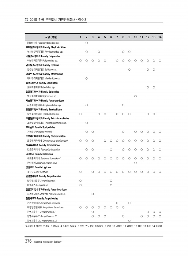 2018 전국 무인도서 자연환경조사 여수 3 376 ? National Institute of Ecology 국명 학명 1 2 3 4 5 6 7 8 9 10 11 12 13 14 [국명미정] Paralacydoniidae sp. ○ 부채발갯지렁이과 Family Phyllodocidae 부채발갯지렁이류 Phyllodocidae sp. ○ ○ ○ ○ 비늘갯지렁이과 Family Polynoidae 비늘갯지렁이류 Polynoidae sp. ○ ○ ○ ○ ○ ○ ○ ○ ○ ○ ○ ○ ○ 염주발갯지렁이과 Family Syllidae 염주발갯지렁이류 Syllidae sp. ○ ○ ○ 대나무갯지렁이과 Family Maldanidae 대나무갯지렁이류 Maldanidae sp. ○ 꽃갯지렁이과 Family Sabellidae...