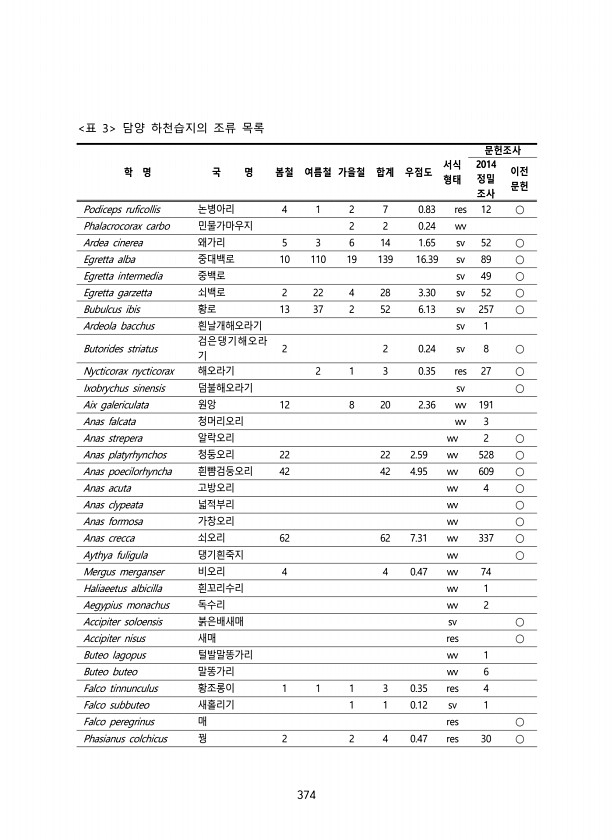 374 학 명 국 명 봄철 여름철 가을철 합계 우점도 서식 형태 문헌조사 2014 정밀 조사 이전 문헌 Podiceps ruficollis 논병아리 4 1 2 7 0.83 res 12 ○ Phalacrocorax carbo 민물가마우지 2 2 0.24 wv Ardea cinerea 왜가리 5 3 6 14 1.65 sv 52 ○ Egretta alba 중대백로 10 110 19 139 16.39 sv 89 ○ Egretta intermedia 중백로 sv 49 ○ Egretta garzetta 쇠백로 2 22 4 28 3.30 sv 52 ○ Bubulcus ibis 황로 13 37 2 52 6.13 sv 257 ○ Ardeola bacchus 흰날개해오라기 sv 1 Butorides striatus 검은댕기해...