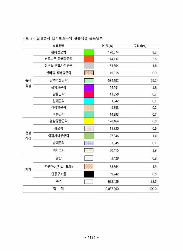 1124 식생유형 면 적 ㎡ 구성비 % 습생 식생 왕버들군락 170,074 8.3 버드나무-왕버들군락 114,137 5.6 선버들-버드나무군락 33,604 1.6 선버들-왕버들군락 19,015 0.9 달뿌리풀군락 534,102 26.2 물억새군락 96,951 4.8 갈풀군락 13,358 0.7 갈대군락 1,942 0.1 검정말군락 4,653 0.2 마름군락 14,293 0.7 건생 식생 환삼덩굴군락 178,464 8.8 칡군락 11,730 0.6 아까시나무군락 27,546 1.4 솜대군락 3,045 0.1 이차초지 80,415 3.9 기타 암반 3,429 0.2 자연하상 자갈, 모래 38,564 1.9 인공구조물 9,242 0.5 수역 682,436 33.5 합 계 2,037,000 100.0 표 3 침실습...