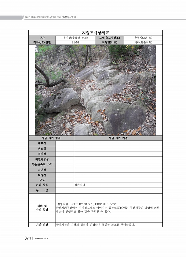 2016 백두대간보호지역 생태계 조사 추풍령밀재 374Ⅰwww.nie.re.kr 지형조사상세표 구간 웅이산 추풍령-큰재 도엽명 도엽번호 추풍령 368131 격자번호-연번 E1-03 지형명 기호 기타 훼손지역 등급 평가 항목 등급 평가 기준 대표성 희소성 특이성 재현가능성 학술?교육적 가치 자연성 다양성 규모 기타 항목 훼손지역 등 급 위치 및 사진 설명 촬영지점 N36° 12′ 33.27″ , E128° 00′ 35.77″ 금산폐쇄구간에서 사기점고개로 이어지는 등산로 50m 에는 등산객들의 답압에 의한 훼손이 진행되고 있는 것을 확인할 수 있다. 기타 의견 촬영지점과 지형의 위치가 인접하여 동일한 좌표를부여하였다.
