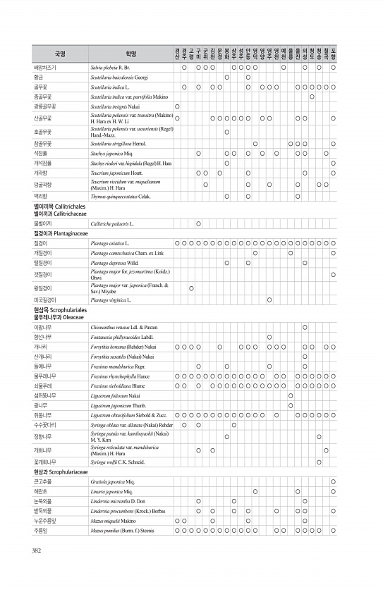 382 배암차즈기 Salvia plebeia R. Br. ○ ○ ○ ○ ○ ○ ○ ○ ○ ○ ○ ○ 황금 Scutellaria baicalensis Georgi ○ ○ 골무꽃 Scutellaria indica L. ○ ○ ○ ○ ○ ○ ○ ○ ○ ○ ○ ○ ○ ○ 좀골무꽃 Scutellaria indica var. parvifolia Makino ○ 광릉골무꽃 Scutellaria insignis Nakai ○ 산골무꽃 Scutellaria pekensis var. transitra Makino H. Hara ex H. W. Li ○ ○ ○ ○ ○ ○ ○ ○ ○ ○ ○ ○ 호골무꽃 Scutellaria pekensis var. ussuriensis Regel Hand.-Mazz. ○ 참골무꽃 Scutella...
