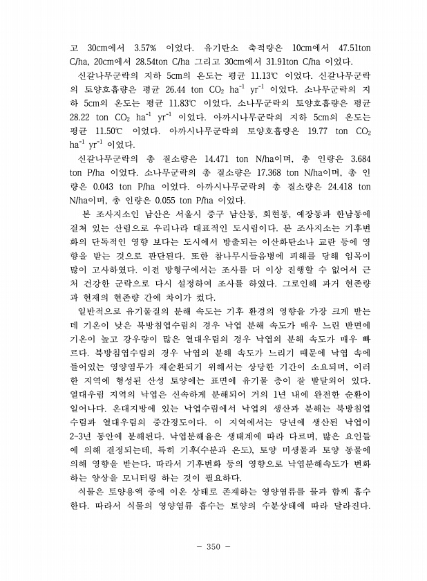 350 고 30cm에서 3.57% 이었다. 유기탄소 축적량은 10cm에서 47.51ton C/ha, 20cm에서 28.54ton C/ha 그리고 30cm에서 31.91ton C/ha 이었다. 신갈나무군락의 지하 5cm의 온도는 평균 11.13℃ 이었다. 신갈나무군락 의 토양호흡량은 평균 26.44 ton CO2 ha-1 yr-1 이었다. 소나무군락의 지 하 5cm의 온도는 평균 11.83℃ 이었다. 소나무군락의 토양호흡량은 평균 28.22 ton CO2 ha-1 yr-1 이었다. 아까시나무군락의 지하 5cm의 온도는 평균 11.50℃ 이었다. 아까시나무군락의 토양호흡량은 19.77 ton CO2 ha-1 yr-1 이었다. 신갈나무군락의 총 질소량은 14.471 ton N/ha이며, 총 인량은 3.684 to...