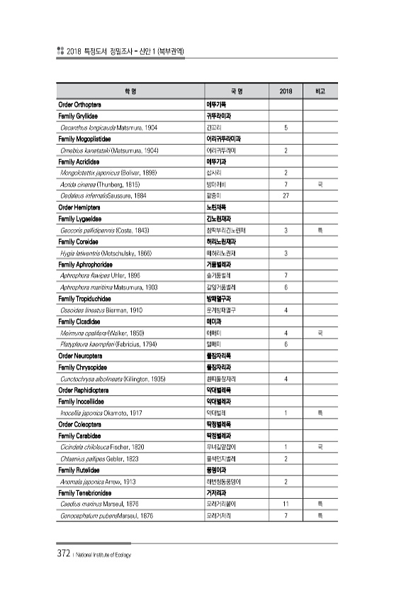 2018 특정도서 정밀조사 신안 1 북부권역 372 ? National Institute of Ecology 학 명 국 명 2018 비고 Order Orthoptera 메뚜기목 Family Gryllidae 귀뚜라미과 Oecanthus longicauda Matsmura, 1904 긴꼬리 5 Family Mogoplistidae 어리귀뚜라미과 Ornebius kanetataki Matsumura, 1904 어리귀뚜라미 2 Family Acrididae 메뚜기과 Mongolotettix japonicus Bolivar, 1898 삽사리 2 Acrida cinerea Thunberg, 1815 방아깨비 7 국 Oedaleus infernalisSaussure, 1884 팥중이 27 Order Hemiptera ...