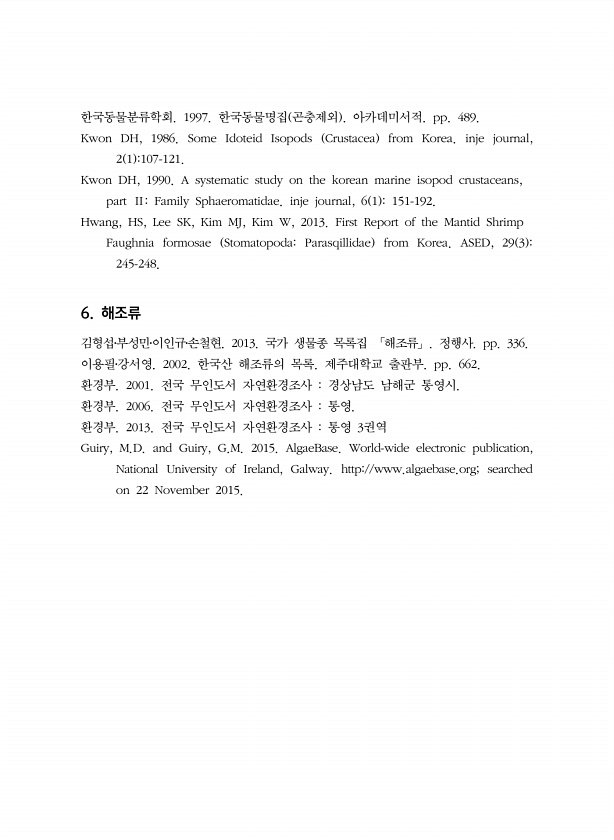 한국동물분류학회. 1997. 한국동물명집 곤충제외 아카데미서적. pp. 489. Kwon DH, 1986. Some Idoteid Isopods Crustacea from Korea. inje journal, 2 1 107-121. Kwon DH, 1990. A systematic study on the korean marine isopod crustaceans, part ⅡFamily Sphaeromatidae. inje journal, 6 1 151-192. Hwang, HS, Lee SK, Kim MJ, Kim W, 2013. First Report of the Mantid Shrimp Faughnia formosae StomatopodaParasqillidae from Korea. ASED, 29 3...