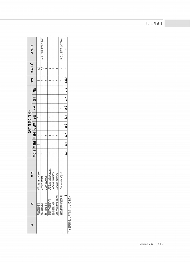 375 과 종 학 명 조사지점 관찰 개체수 합계 관찰시기* 과거기록 덕산리 덕현골 이길리 산명호 동송 토교 빙애 사동 세줄깡충거미 Plexippus setipes 7 1 1 9 a,b 까치깡충거미 Rhene atrata 1 1 3 1 6 a,b 국립산림과학원 2004 청띠깡충거미 Siler cupreus 5 5 c 흰줄무늬깡충거미 Sitticus albolineatus 6 6 c 홀아비깡충거미 Sitticus avocator 2 2 a 고리무늬마른깡충거미 Sitticus fasciger 4 4 c 검은날개무늬깡충거미 Telamonia vlijmi 1 1...