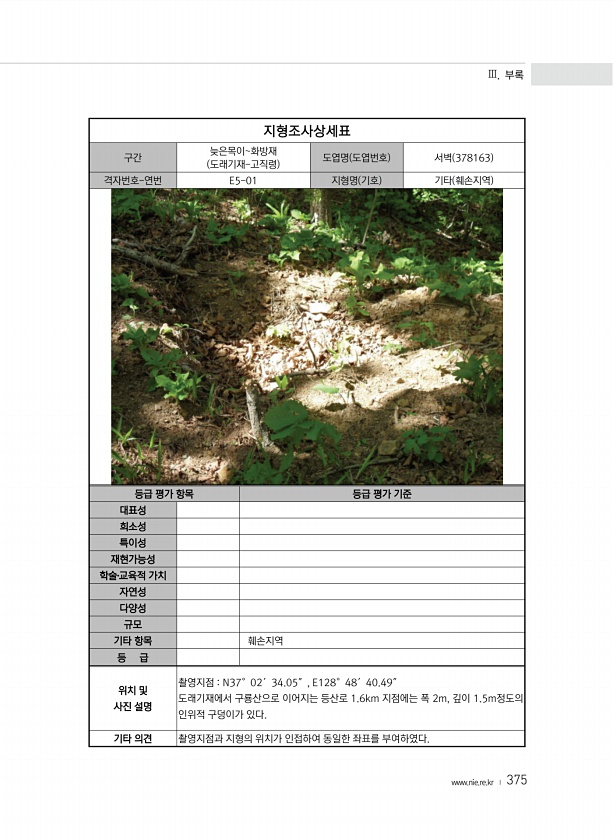 Ⅲ. 부록 www.nie.re.kr ? 375 지형조사상세표 구간 늦은목이화방재 도래기재-고직령 도엽명 도엽번호 서벽 378163 격자번호-연번 E5-01 지형명 기호 기타 훼손지역 등급 평가 항목 등급 평가 기준 대표성 희소성 특이성 재현가능성 학술?교육적 가치 자연성 다양성 규모 기타 항목 훼손지역 등 급 위치 및 사진 설명 촬영지점 N37°02′34.05″, E128°48′40.49″ 도래기재에서 구룡산으로 이어지는 등산로 1.6km 지점에는 폭 2m, 깊이 1.5m정도의 인위적 구덩이가 있다. 기타 의견 촬영지점과 지형의 위치가 인접하여 동일한 좌표를부여하였다.