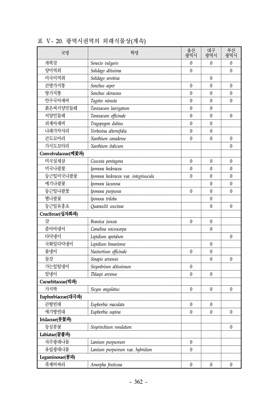 표 Ⅴ- 20. 광역시권역의 외래식물상 계속 국명 학명 울산 광역시 대구 광역시 부산 광역시 개쑥갓 Senecio vulgaris 0 0 0 양미역취 Solidago altissima 0 0 미국미역취 Solidago serotina 0 큰방가지똥 Sonchus asper 0 0 0 방가지똥 Sonchus oleraceus 0 0 0 만수국아재비 Tagetes minuta 0 0 0 붉은씨서양민들레 Taraxacum laevigatum 0 0 서양민들레 Taraxacum officinale 0 0 0 쇠채아재비 Tragopogon dubius 0 0 나래가막사리 Verbesina alternifolia 0 0 큰도꼬마리 Xanthium canadense 0 0 0 가시도꼬마리 Xanthium italicum...