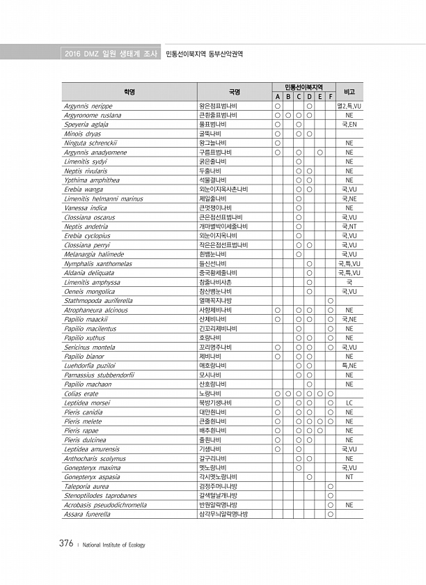 2016 DMZ 일원 생태계 조사 민통선이북지역 동부산악권역 376 ? National Institute of Ecology 학명 국명 민통선이북지역 비고 A B C D E F Argynnis nerippe 왕은점표범나비 ○ ○ 멸2,특,VU Argyronome ruslana 큰흰줄표범나비 ○ ○ ○ ○ NE Speyeria aglaja 풀표범나비 ○ ○ 국,EN Minois dryas 굴뚝나비 ○ ○ ○ Ninguta schrenckii 왕그늘나비 ○ NE Argynnis anadyomene 구름표범나비 ○ ○ ○ NE Limenitis sydyi 굵은줄나비 ○ NE Neptis rivularis 두줄나비 ○ ○ NE Ypthima amphithea 석물결나비 ○ ○ NE Erebia wanga 외눈이지옥...