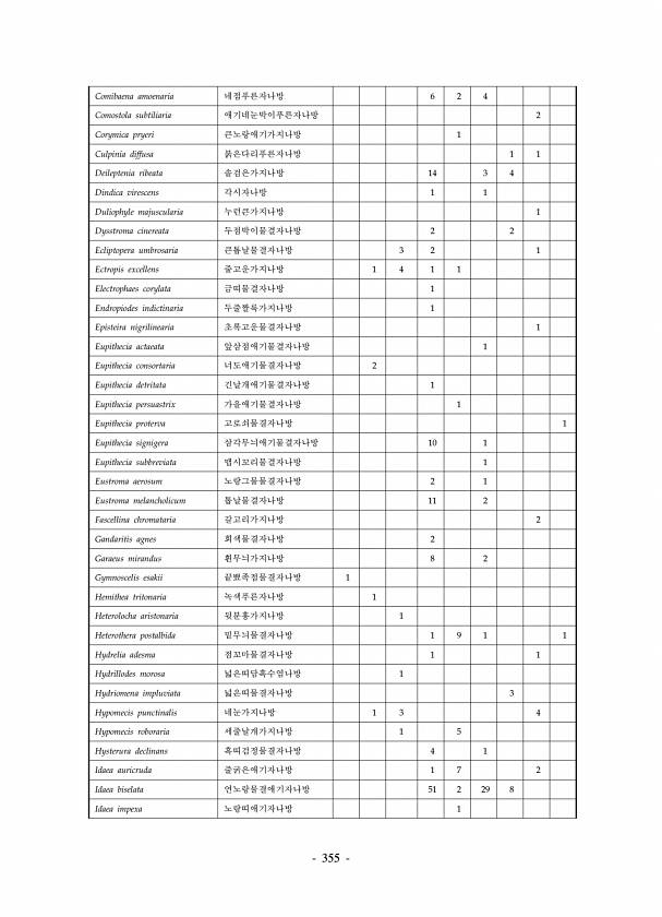 355 Comibaena amoenaria 네점푸른자나방 6 2 4 Comostola subtiliaria 애기네눈박이푸른자나방 2 Corymica pryeri 큰노랑애기가지나방 1 Culpinia diffusa 붉은다리푸른자나방 1 1 Deileptenia ribeata 솔검은가지나방 14 3 4 Dindica virescens 각시자나방 1 1 Duliophyle majuscularia 누런큰가지나방 1 Dysstroma cinereata 두점박이물결자나방 2 2 Ecliptopera umbrosaria 큰톱날물결자나방 3 2 1 Ectropis excellens 줄고운가지나방 1 4 1 1 Electrophaes corylata 금띠물결자나방 1 Endropiodes indictinaria 두줄짤룩가지...